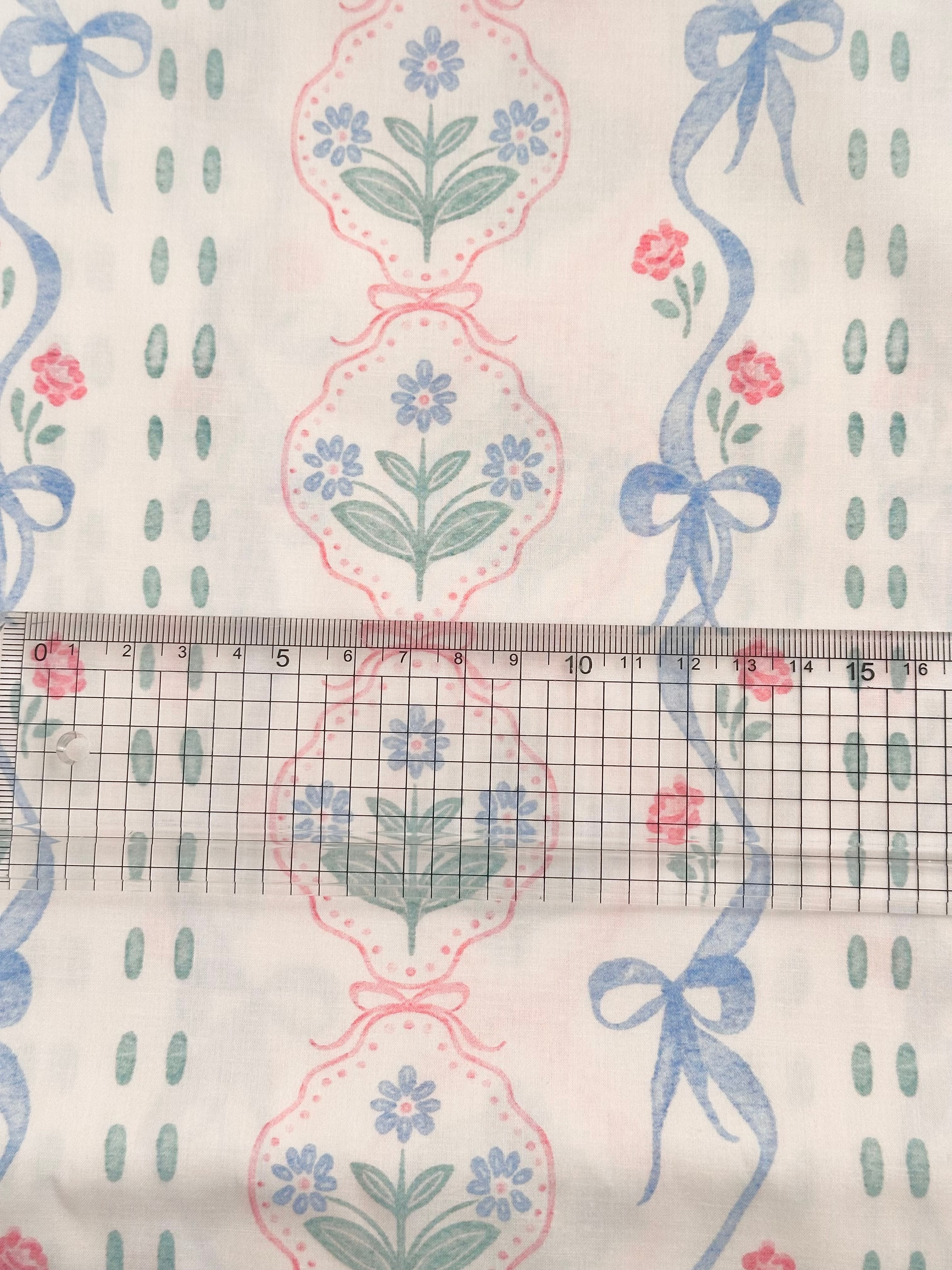 淡いピンクベージュの地色に、ブルー・グリーン・小花のピンク。